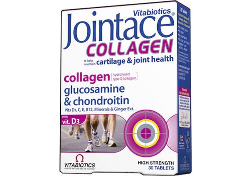 Το συμπλήρωμα διατροφής JOINTACE Collagen της Vitabiotics περιέχει ανά δύο ταμπλέτες 300mg κολλαγόνου, 1000mg θειικής γλυκοσαμίνης και 100mg θειικής χονδροϊτίνης. Το κολλαγόνο αποτελεί δομικό συστατικό του χόνδρου και είναι ιδιαίτερα ωφέλιμη η λήψη του από άτομα άνω των 45 ετών, αθλητές ή άτομα που έχουν χειρουργηθεί στις αρθρώσεις. Η θειική γλυκοσαμίνη και η θειική χονδροϊτίνη αποτελούν δομικά συστατικά του χόνδρου των αρθρώσεων και δρουν συνεργιστικά για να επιτύχουν την αναδόμηση και την επιδιόρθωση του χόνδρου, συμβάλλοντας στην κινητικότητα και την ευκαμψία των αρθρώσεων και τη μείωση της φλεγμονής και του πόνου. Στο JOINTACE Collagen περιέχεται επίσης ginger, το οποίο έχει αντιφλεγμονώδεις και αντιοξειδωτικές ιδιότητες και συμβάλλει στη μείωση του πόνου και τη διατήρηση της κινητικότητας των αρθρώσεων. Οι βιταμίνες και τα μέταλλα συμβάλλουν στην υγεία των αρθρώσεων μέσω της εμπλοκής τους στα μονοπάτια της φλεγμονής, μέσω της αντιοξειδωτικής τους δράσης ή μέσω της συμβολής τους στην υγεία των οστών και το μεταβολισμό του ασβεστίου.