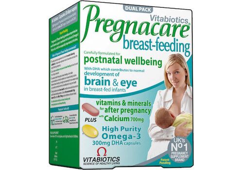 Το συμπλήρωμα διατροφής Pregnacare Breast-feeding της Vitabiotics είναι μια διπλή συσκευασία που περιλαμβάνει πολυβιταμινούχες ταμπλέτες με ασβέστιο, βιταμίνες και μέταλλα και κάψουλες με ωμέγα-3 λιπαρά οξέα, συστατικά απαραίτητα για την περίοδο του θηλασμού. Οι ταμπλέτες του Pregnacare Breast-feeding περιέχουν 700mg ασβεστίου, η λήψη του οποίου είναι απαραίτητη κατά την περίοδο του θηλασμού για την αποφυγή απώλειας ασβεστίου από τα οστά της μητέρας και τη μεταφορά του στο βρέφος μέσω του μητρικού γάλακτος για τη σωστή ανάπτυξη του σκελετού του.