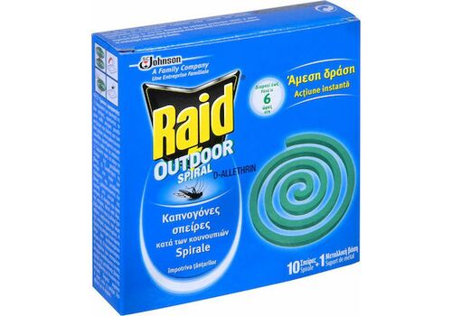 Το Raid® Spiral, καπνογόνες σπείρες κατά των κουνουπιών, προσφέρει αποτελεσματική προστασία σε εξωτερικούς χώρους όπως κήπους, καταστρώματα σκαφών, κάμπινγκ, μπαλκόνια.