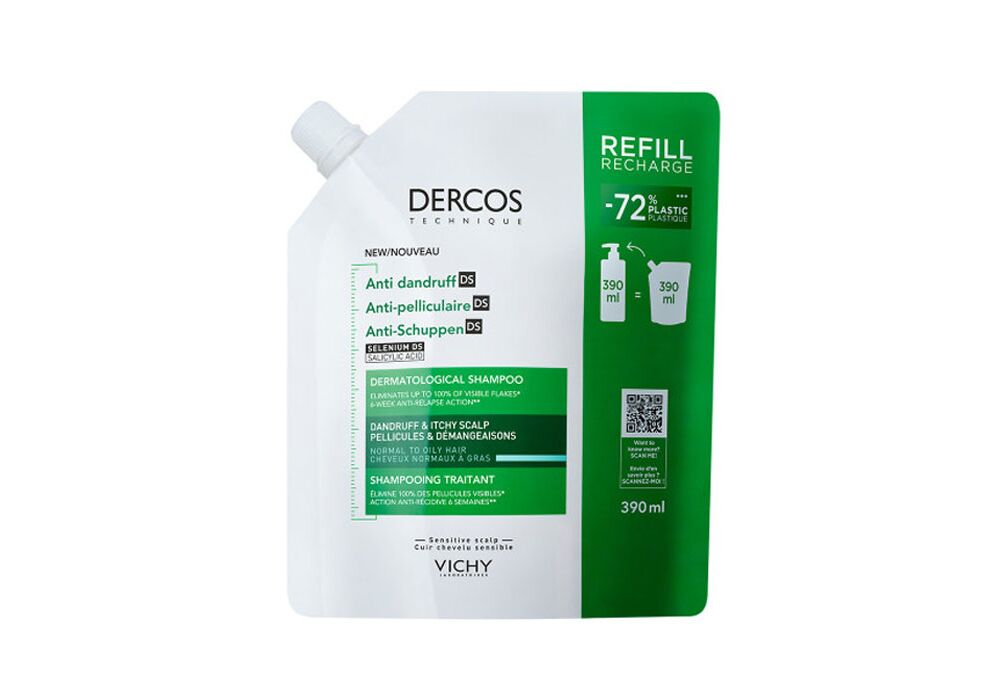Το Vichy Dercos Anti-Dandruff DS Refill είναι ένα ανταλλακτικό σαμπουάν που συνιστάται από δερματολόγους για την καταπολέμηση της πιτυρίδας και του κνησμού. Ιδανικό για κανονικά έως λιπαρά μαλλιά, εξαλείφει έως και το 100% της ορατής πιτυρίδας ήδη από την πρώτη χρήση. Με Selenium DS και σαλικυλικό οξύ, δρα σε βάθος για να επαναφέρει την υγιή ισορροπία του τριχωτού. Επιπλέον, η τεχνολογία μικροβιώματος προσφέρει προστασία έως και 6 εβδομάδες από την επανεμφάνιση της πιτυρίδας. Η σύνθεσή του είναι ευχάριστη, με πλούσιο αφρό και ανάλαφρο άρωμα, ενώ είναι ιδανικό για καθημερινή χρήση από άνδρες και γυναίκες. Τεχνολογία μικροβιώματος με Selenium DS* που αποκαθιστά αποδεδειγμένα την ισορροπία στο μικροβίωμα, ένα σύνολο μικροοργανισμών που βρίσκονται στο τριχωτό της κεφαλής. Άμεση και συνολική εξυγίανση του τριχωτού: εξάλειψη πιτυρίδας, ρύθμιση απολέπισης. Κλινικά Αποδεδειγμένη αποτελεσματικότητα: • 100% εξάλειψη της ορατής πιτυρίδας. • Καταπραΰνει το αίσθημα κνησμού. • Δράση κατά της επανεμφάνισης για 6 εβδομάδες. Η γνώμη των χρηστών: -Προσφέρει άμεση και ορατή αποτελεσματικότητα: 96% - Προλαμβάνει την επανεμφάνιση της πιτυρίδας: 92% - Καταπραΰνει το τριχωτό της κεφαλής: 97% - Δείχνει να είναι πιο αποτελεσματικό από τα μέχρι σήμερα γνωστά προϊόντα κατά της πιτυρίδας: 91% ΣΕ ΝΕΑ ΟΙΚΟΛΟΓΙΚΗ REFILL ΣΥΣΚΕΥΑΣΙΑ Με λιγότερο πλαστικό- λιγότερα απόβλητα κατά την παραγωγή και χαμηλότερο περιβαλλοντικό αποτύπωμα.