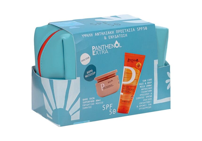Panthenol Extra Promo Α Brighter Way to Care Αντηλιακό Γαλάκτωμα Σώματος & Προσώπου SPF50, 200ml, Bare Skin Superfood Mousse Σώματος, 80ml & Δώρο Νεσεσέρ, 1τεμ, 1σετ