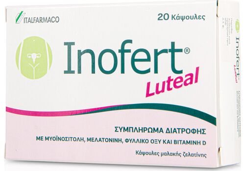 Το Inofert Luteal είναι ένα μοναδικό συμπλήρωμα διατροφής που περιέχει μυο-ινοσιτόλη, μελατονίνη, χολικαλσιφερόλη και φυλλικό οξύ για τις γυναίκες που επιθυμούν εγκυμοσύνη. Χάρη στην ειδικά σχεδιασμένη σύνθεσή του, το Inofert Luteal® βελτιώνει τη δεκτικότητα του ενδομητρίου, αυξάνοντας τις πιθανότητες επίτευξης εγκυμοσύνης.