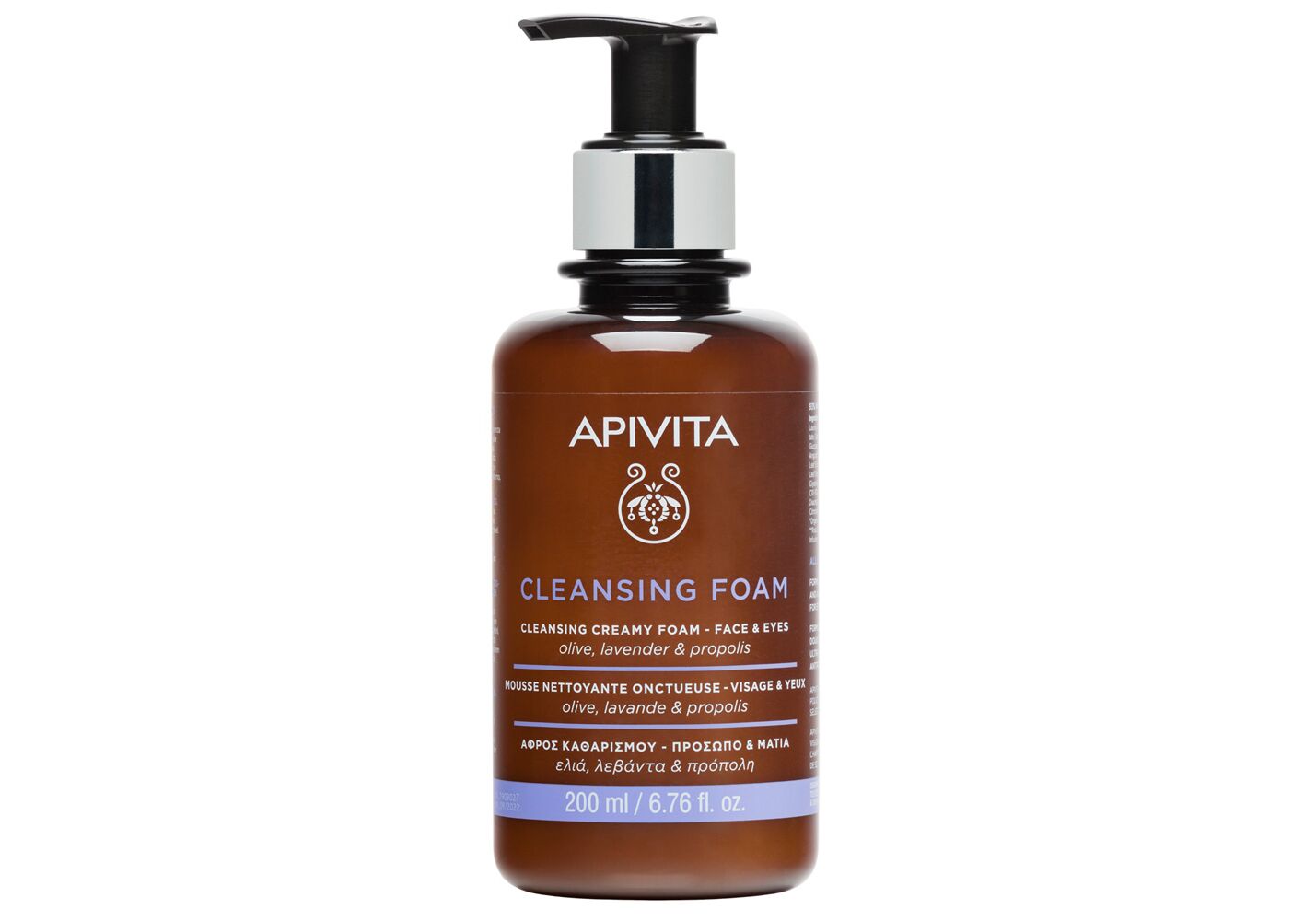 Ο κρεμώδης αφρός καθαρισμού περιέχει σαπωνάρια και άλλα φυσικά συστατικά καθαρισμού που απομακρύνουν ρύπους και μακιγιάζ χωρίς να ξηραίνουν την επιδερμίδαΗ ελιά ενυδατώνει και η πρόπολη προσφέρει ήπια αντισηπτική δράση, τέλος η λεβάντα καταπραϋνει