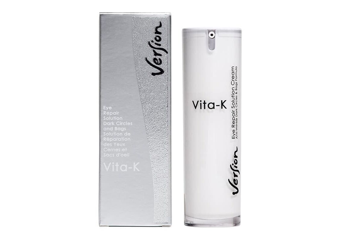 Η Version Vitα – K Eye Repair Solution, βασισμένη σε ένα φυτικό ισοδύναμο της βιταμίνης Κ, το Dekapeptide-4, τα φυτικά εκχυλίσματα και τα δραστικά συστατικά (Μedicago sativa extract, Εscin, a-Αrbutin), δρα σε πολλαπλά επίπεδα για την αντιμετώπιση των προβλημάτων της ευαίσθητης περιοχής κάτω από τα μάτια.