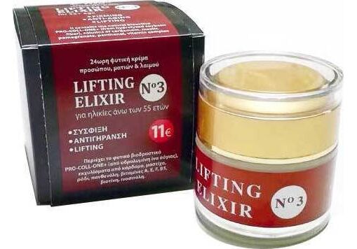 Η 24ωρη φυτική κρέμα προσώπου, ματιών και λαιμού Lifting Elixir No3 είναι καινοτόμο προϊόν με αποτέλεσμα lifting. Περιέχει το φυτικό βιοδραστικό PRO-COLL-ONE+ από υδρολυμένη ίνα σόγιας που γεμίζει τις ρυτίδες.