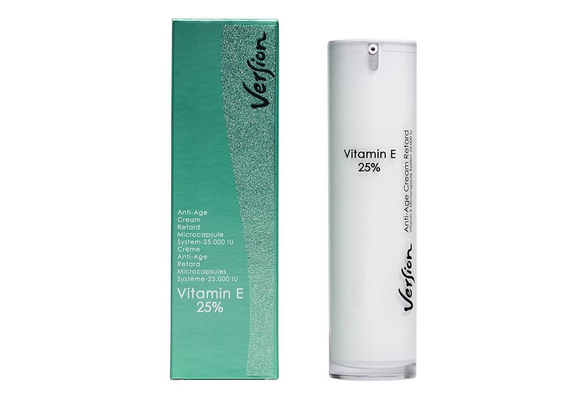 - Η Version Vitamin E 25% Anti Age Cream είναι ειδικά παρασκευασμένη με 25.000 Μονάδες (IU) Βιταμίνης Ε, διεγείρει την σύνθεση των συστατικών της εξωκυττάριας θεμέλιας ουσίας, έχει αντιρυτιδική δράση, μειώνει την ξηρότητα του δέρματος και τη διαδερμική απώλεια νερού, με αποτέλεσμα να δίνει ένα δέρμα πιο σφιχτό και σφριγηλό.