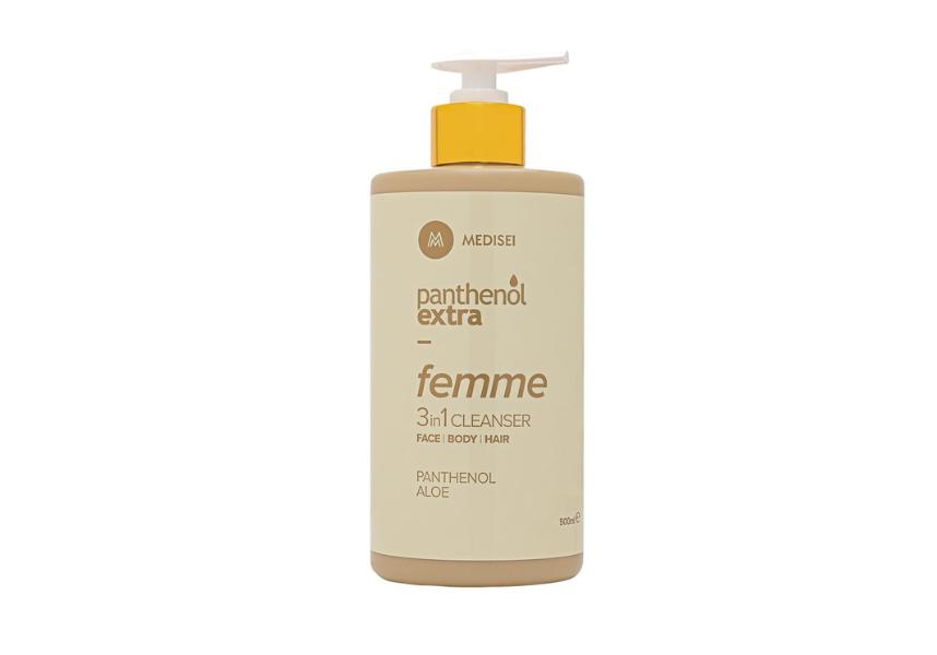 Το Panthenol Extra Femme 3 in 1 Cleanser είναι αφρόλουτρο και σαμπουάν μαζί, ιδανικό για καθημερινή χρήση σε πρόσωπο, σώμα και μαλλιά.