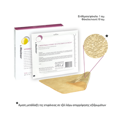Το επίθεμα L-Mesitran® Hydro 10cm X 10cm είναι ένα ελαφρά κολλητικό πολυμερές επίθεμα με αδιάβροχη εξωτερική επιφάνεια και αποτελεί άριστη επιλογή επούλωσης επιφανειακών ελκών με κάθε βαθμό εξιδρώματος ή ήπιες νεκρώσεις κυττάρων