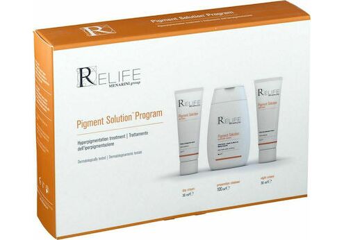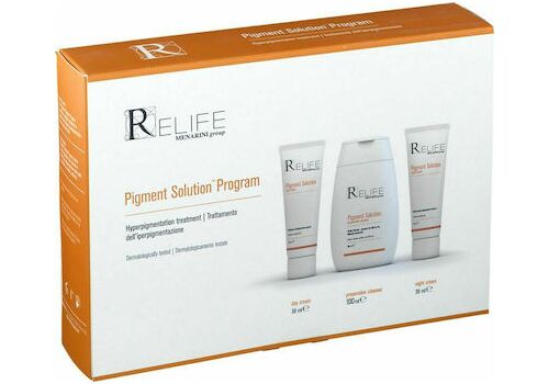 Menarini Relife Set για την θεραπεία της υπέρχρωσης που περιλαμβάνει την Pigment Solution Day Cream Κρέμα Ημέρας 30ml, Pigmnent Solution Night Cream Κρέμα Νύχτας 30ml & Pigment Solution Preparation Cleanser Καθαριστικό 100ml.