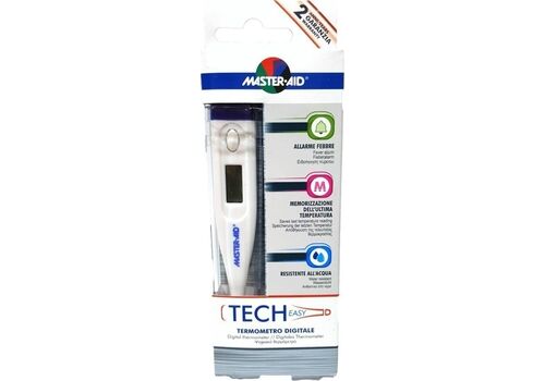 Το ψηφιακό θερμόμετρο TechEasy της Master-Aid χρησιμοποιείται για τις μετρήσεις της από στόματος, μασχαλιαίας και ορθικής θερμοκρασίας και είναι εφοδιασμένο με οθόνη LCD προσφέροντας μια πολύ εύκολη ανάγνωση της μέτρησης. Μετρήστε τη θερμοκρασία σε 60 δευτερόλεπτα. Είναι εξοπλισμένο με ένα σήμα που προειδοποιεί μόλις ολοκληρωθεί η μέτρηση της θερμοκρασίας. Σε περίπτωση θερμοκρασίας άνω των 37,5 ° C υπάρχει “συναγερμός πυρετού” που αποτελείται από 10 σύντομα μπιπ σε 4 δευτερόλεπτα. Η τελευταία ανιχνευόμενη θερμοκρασία παραμένει στη μνήμη. ΤοTechEasyείναι ακριβές (+ - 0,1 ° C). Απενεργοποιείται αυτόματα μετά από 10 λεπτά αδράνειας.