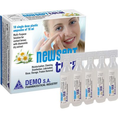 Διάλυμα πολλαπλών χρήσεων Newsept Total monodese 10x10ml από τη Demo S.A. με εκχύλισμα χαμομηλιού. Κατάλληλο για όλους τους τύπους μαλακών φακών επαφής. Καθαρίζει & απολυμαίνει τους φακούς επαφής σας ενώ τους λιπαίνει. Πρακτική συσκευασία για εύκολη μεταφορά. Περιέχει τη θήκη των φακών.