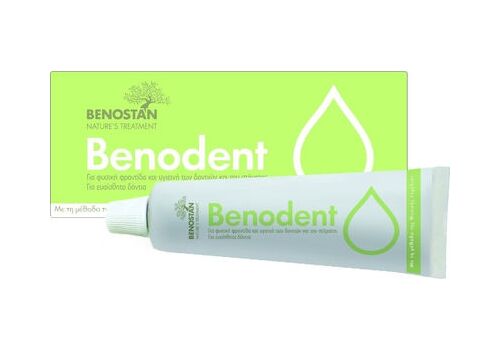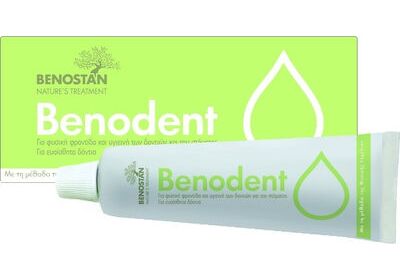 Η οδοντόκρεμα Benodent είναι μια εντελώς φυτική οδοντόκρεμα με αντισηπτική, αντιβακτηριακή και αντιφλεγμονώδη δράση, για ευαίσθητα ούλα και δόντια. Είναι πλούσια σε εκχυλίσματα μαστίχας Χίου, δεντρολίβανου, χαμομηλιού και υπέρικου (γνωστό και ως βάλσαμο), συνδυασμός που αποτρέπει την οδοντική πλάκα και δυναμώνει τα ούλα.