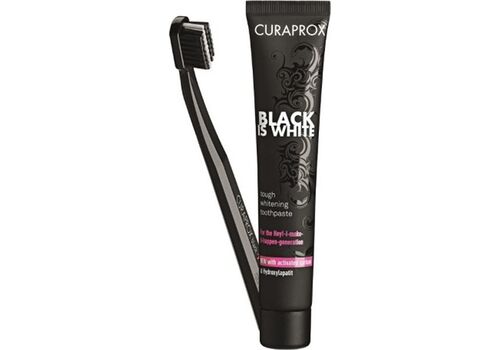 Curaprox Πακέτο Προσφοράς Black Is White Λευκαντική Οδοντόπαστα 90ml + Οδοντόβουρτσα. Λευκαντική οδοντόκρεμα με ενεργό άνθρακα