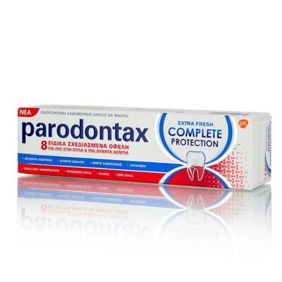 Η οδοντόκρεμα Parodontax Complete Protection έχει 8 ειδικά σχεδιασμένα οφέλη για πιο υγιή ούλα και πιο δυνατά δόντια. Βουρτσίζοντας δύο φορές την ημέρα με την οδοντόκρεμα Parodontax Complete Protection δε χρειάζεται να επιλέξετε αν θα φροντίσετε τα δόντια ή τα ούλα σας - μπορείτε να φροντίζετε και τα δύο ταυτόχρονα.