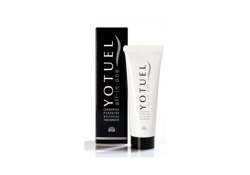 YOTUEL All in one. Λευκαντική Οδοντόκρεμα. Με Υπεροξείδιο Καρβαμιδίου που απελευθερώνει Ενεργά Μικροσωματίδια Οξυγόνου. Πλούσια σε Ξυλιτόλη & Φθόριο.