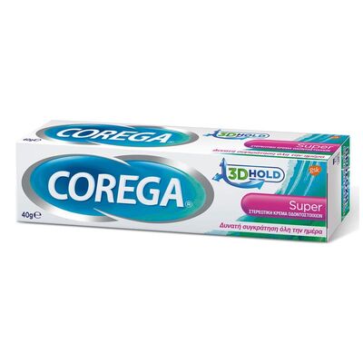 Τα στερεωτικά προϊόντα Corega συγκρατούν την τεχνητή οδοντοστοιχία σας αποτρέποντας την μετακίνησή της σε κάθε κατεύθυνση και τη σφραγίζουν. Έτσι εμποδίζουν την εισχώρηση των υπολειμμάτων τροφής, για να μπορείτε να απολαμβάνετε τα φαγητά που σας αρέσουν. Με τις τεχνητές οδοντοστοιχίες σας να παραμένουν στη θέση τους όλη μέρα, μπορείτε να απολαμβάνετε τη ζωή χωρίς δεύτερη σκέψη.Η στερεωτική κρέμα Corega Super προσφέρει 3D συγκράτηση, περιορίζοντας τη μετακίνηση της τεχνητής οδοντοστοιχίας σας προς όλες τις κατευθύνσεις: εμπρός και πίσω, πάνω και κάτω, και πλευρικά, ώστε να μην ανησυχείτε κατά τη διάρκεια της ημέρας. Βοηθά στη δυνατή συγκράτηση της οδοντοστοιχίας μέχρι και για 12 ώρες.