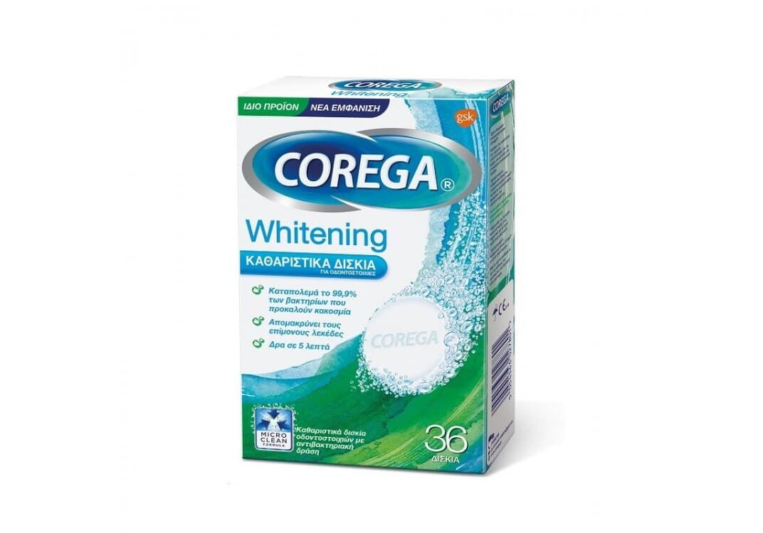 Corega Whitening - Καθαριστικά Δισκία Οδοντοστοιχιών, 36 ταμπλέτες