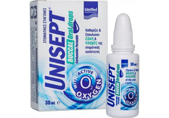 Στοματικές σταγόνες Intermed Unisept Oromucosal για τον καθαρισμό, τη γρήγορη επούλωση, την ανακούφιση ελκών και πληγών της στοματικής κοιλότητας καθώς και την αποτελεσματική αντιμετώπιση φλεγονών και ουλορραγιών. Επίσης, είναι κατάλληλο για την ουλίτιδα της εγκυμοσύνης.