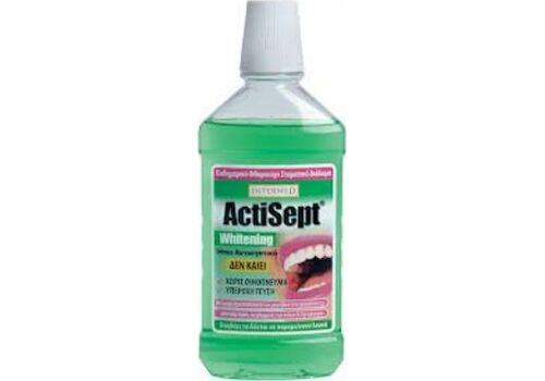 Το Intermed Actisept Whitening Mouthwash είναι καθημερινό φθοριούχο στοματικό διάλυμα με ήπια αντισηπτική δράση,για την καθημερινή και αποτελεσματική καταπολέμηση των μικροοργανισμών που προκαλούν κακοσμία, πλάκα και φλεγμονές των ούλων καθώς και την ενίσχυση και προστασία της αδαμαντίνης των δοντιών ενώ ταυτόχρονα συμβάλει στη διατήρηση της φυσικής λευκότητας των δοντιών.