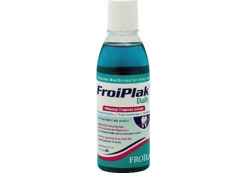 Το Froiplak Daily είναι ένα στοματικό διάλυμα κατάλληλο για την καθημερινή στοματική υγιεινή δοντιών και ούλων, με ευχάριστη γεύση χαρίζοντας δροσερή αναπνοή που διαρκεί έως και 8 ώρες. Περιέχει φλαβονοειδή εσπεριδοειδών με ευρύ αντιμικροβιακό φάσμα (ενάντια σε βακτήρια, μύκητες και ιούς) και Χλωρεξιδίνη ενάντια στη μικροβιακή πλάκα. Μειώνει τη φλεγμονή των ούλων ενώ παράλληλα ισχυροποιεί την αδαμαντίνη.ΕΝΔΕΙΞΕΙΣ