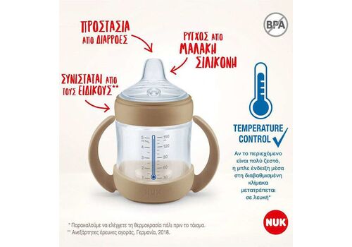 Επίσης, είναι προφανές ότι προστατεύει από διαρροές. Επιπλέον, υπάρχει η καινοτομία του Δείκτη Ελέγχου Θερμοκρασίας της NUK που από μπλε γίνεται λευκός όταν το περιεχόμενο του μπιμπερό είναι πολύ ζεστό. Ιδανικά, το υγρό θα πρέπει να έχει θερμοκρασία σώματος (37 °C = μεσαία απόχρωση του μπλε). Αυτό κάνει την εκμάθηση ακόμη πιο εύκολη.