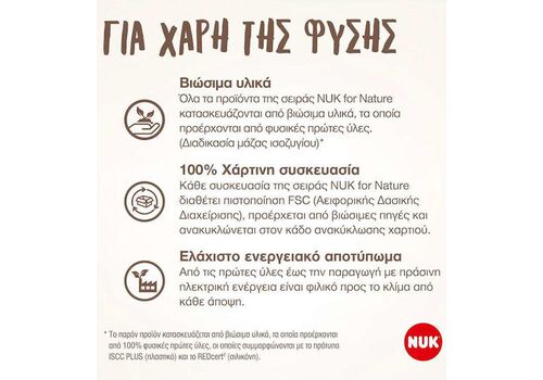 Για όλα τα προϊόντα NUK for Nature χρησιμοποιούμε 100% χάρτινες ανακυκλώσιμες συσκευασίες, πιστοποιημένες κατά το πρότυπο αειφορικής διαχείρισης δασών FSC. Και για να μειώσουμε ακόμη περισσότερο το ανθρακικό αποτύπωμα, τα πάντα, από τις πρώτες ύλες ως την παραγωγή με πράσινη ηλεκτρική ενέργεια, βελτιστοποιούνται, ώστε να είναι φιλικά προς το κλίμα.