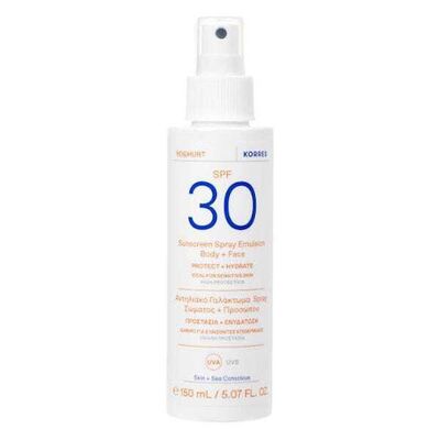 Το Korres Yoghurt Γιαούρτι Αντηλιακό Γαλάκτωμα Spray SPF30 για πρόσωπο και σώμα, χαρίζει προστασία από τη φωτογήρανση και από το ευρύ φάσμα της ακτινοβολίας UVA + UVB.