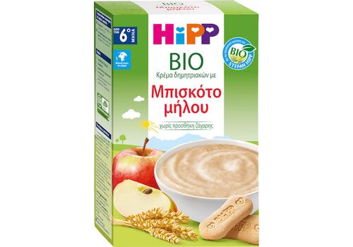 Η Hipp Bio Κρέμα Δημητριακών με Μπισκότο Μήλου περιέχει θρεπτικά δημητριακά ολικής άλεσης, μπισκότα & χυλό μήλου, όλα βιολογικής καλλιέργειας.