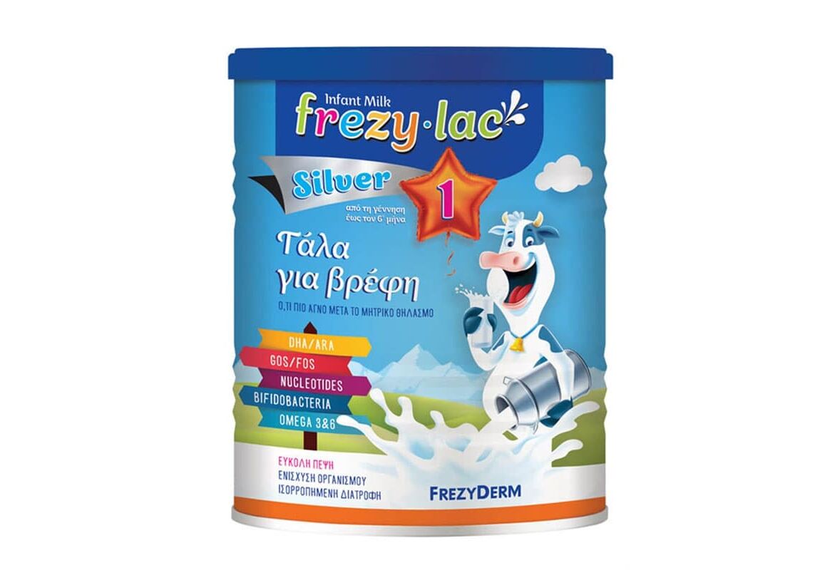 Το FREZYLAC SILVER 1 είναι αγνό αγελαδινό γάλα σε σκόνη, κατάλληλο για τη διατροφή του τελειόμηνου βρέφους από τη γέννηση έως τον 6° μήνα. Παράγεται από υψηλής ποιότητας αγελαδινό γάλα, ακολουθώντας αυστηρά πρότυπα γεωργίας και κτηνοτροφίας και περιέχει όλα τα απαραίτητα συστατικά για τη σωστή ανάπτυξη του βρέφους τους πρώτους μήνες της ζωής του: Βιταμίνες, Μέταλλα, Πρεβιοτικά, Νουκλεοτίδια, DHA/ARA, Προβιοτικά, συνδυάζονται ιδανικά για να ενισχύουν τον οργανισμό και να εξασφαλίσουν μία καλή μελλοντική υγεία.