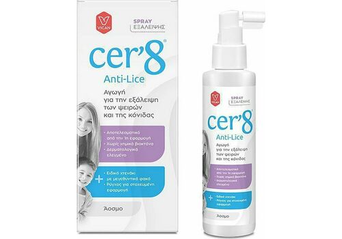 Το Cer’8 Anti-Lice Spray εξάλειψης με διμεθικόνη αποτελεί ένα καινοτόμο ιατροτεχνολογικό προϊόν - lotion αντιμετώπισης της φθειρίασης μέσα σε 15 μόνο λεπτά. Άοσμο και χωρίς χημικά βιοκτόνα, αλλά με ήπια συστατικά φιλικά με την επιδερμίδα, δρα παρεμποδίζοντας την αναπνευστική οδό της ψείρας με αποτέλεσμα την εξόντωσή της.