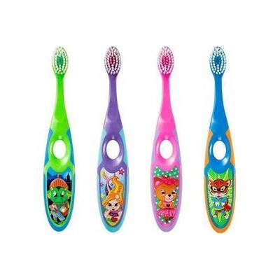 Στρογγυλή κεφαλή με έξτρα μαλακές ίνες σχεδιασμένες για να καθαρίζουν τα πρώτα δοντάκια του, καθώς και μια ένδειξη για την θέση και ποσότητα της οδοντόκρεμας (μπλε ίνες).