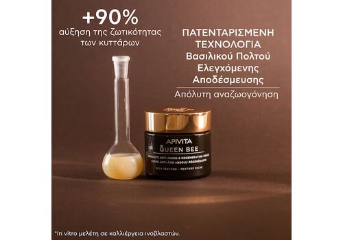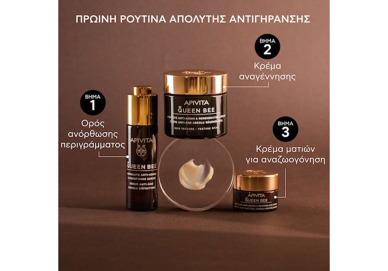 Η Apivita Queen Bee Absolute Anti-Aging & Regenerating Cream είναι μια μεταξένια κρέμα ημέρας με πατενταρισμένη τεχνολογία ελεγχόμενης αποδέσμευσης που εξασφαλίζει σταδιακή διάχυση βασιλικού πολτού υψηλής συγκέντρωσης.