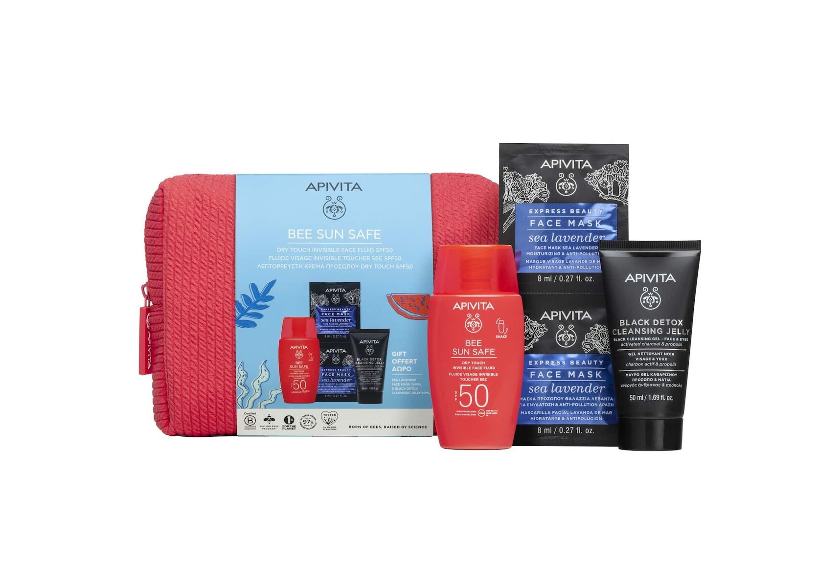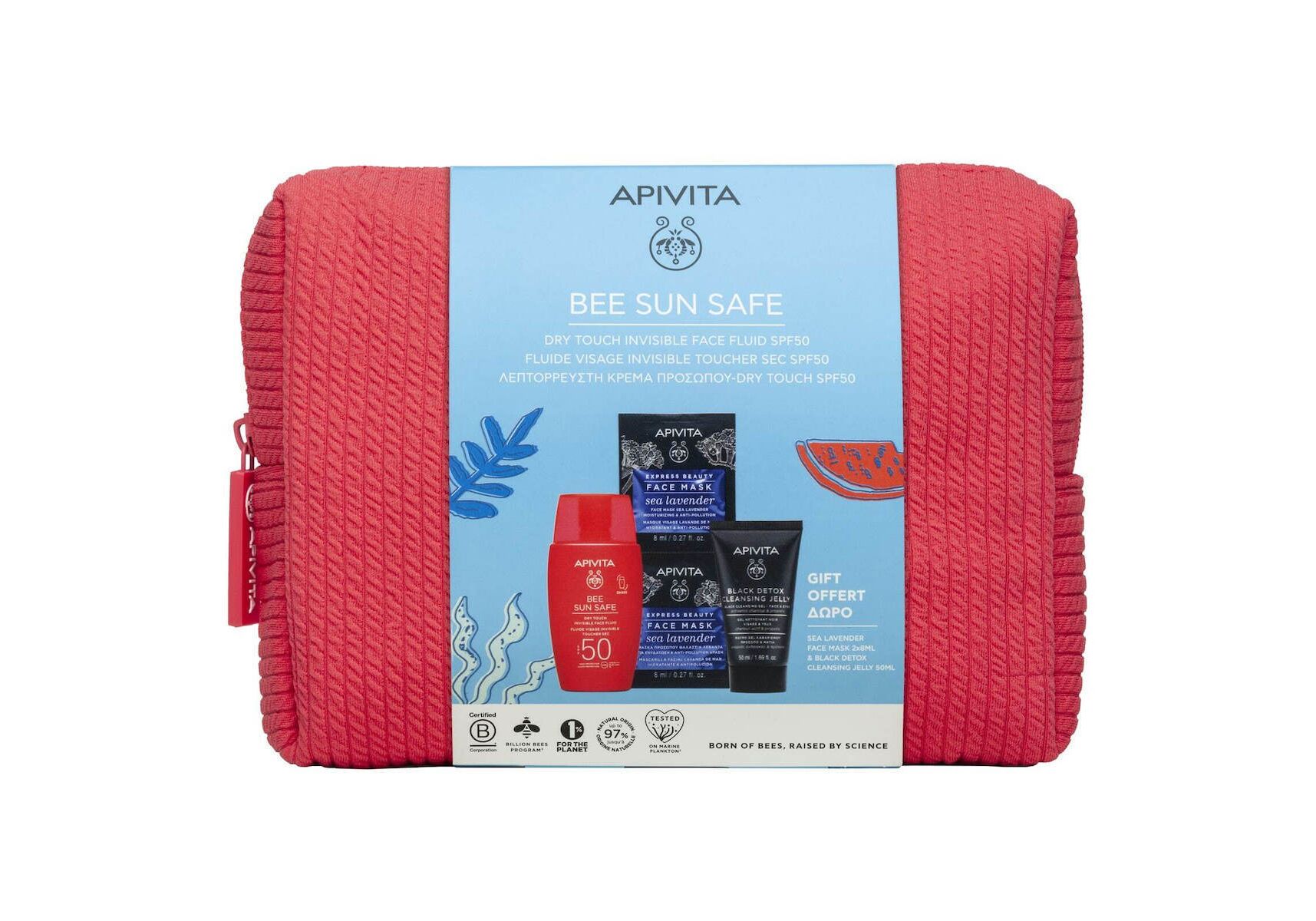 Apivita Bee Sun Safe Dry Touch Invisible Face Fluid SPF50 Promo Pack, Λεπτόρρευστη Αντηλιακή Κρέμα SPF50 50ml & ΔΩΡΟ Τζελ Καθαρισμού 50ml & Μάσκα Προσώπου Θαλάσσια Λεβάντα 2x8ml