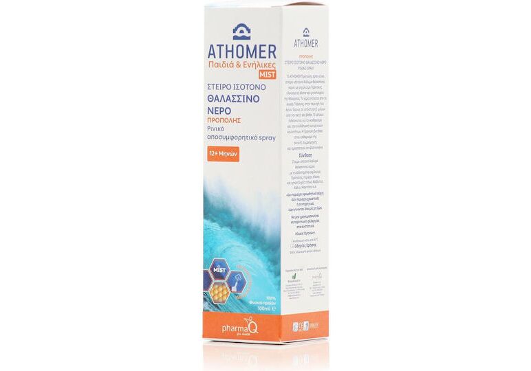 Το Athomer Babies & Adults Mist Ισότονο Αποσυμφορητικό Θαλασσινό Νερό Με Πρόπολη 100 ml είναι ένα αποστειρωμένο ισότονο διάλυμα θαλασσινού νερού εμπλουτισμένο με εκχύλισμα Πρόπολης (0,4%), γνωστό για τις καταπραϋντικές, μαλακτικές και αντισηπτικές του ιδιότητες.