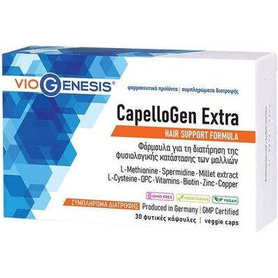 Το Viogenesis CapelloGen Extra Hair Support Formula 30 φυτικές κάψουλες είναι ένα συμπλήρωμα διατροφής ειδικά σχεδιασμένο για την υγεία και τη διατήρηση της φυσιολογικής κατάστασης των μαλλιών.
