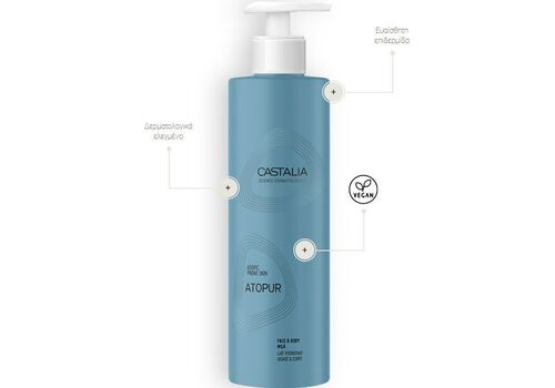 To Castalia Atopur Face & Body Milk συνδυάζει συστατικά με αποδεδειγμένη ενυδατική και καταπραϋντική δράση, που ενισχύουν τον δερματικό φραγμό και εξισορροπούν το μικροβίωμα.