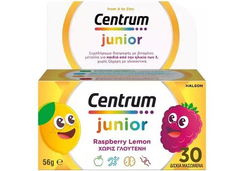 Το Centrum Junior, με ειδικά διαμορφωμένη σύνθεση βιταμινών και μετάλλων, συμπληρώνει την καθημερινή διατροφή των παιδιών. Κατάλληλο για παιδιά 4 ετών και άνω. Σε μασώμενα δισκία. Με ευχάριστη γεύση βατόμουρο-λεμόνι.
