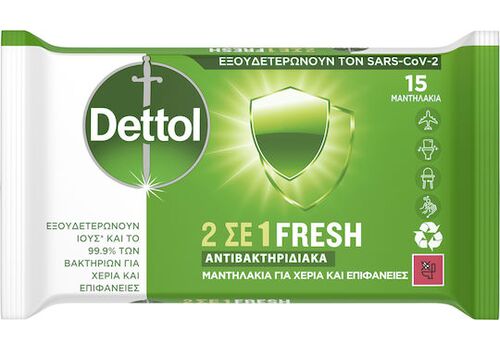 Dettol 2 σε 1 Fresh Αντιβακτηριδιακά Μαντηλάκια για Χέρια & Επιφάνειες 15τμχ