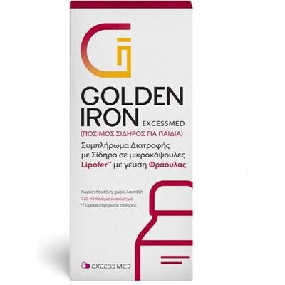 Το συμπλήρωμα διατροφής Golden Iron της ExcessMed σε πόσιμο εναιώρημα με φόρμουλα χωρίς γλουτένη και λακτόζη η οποία αποτελείται από πυροφωσφορικό σίδηρο και βιταμίνες Β6 και Β12, συνδυασμός που συμβάλλει στην ομαλή γνωσιακή ανάπτυξη του παιδιού, στον φυσιολογικό σχηματισμό των ερυθρών αιμοσφαιρίων και της αιμοσφαιρίνης, στη φυσιολογική μεταφορά του οξυγόνου στο σώμα, ενώ συμμετέχει στη διαδικασία της κυτταρικής διαίρεσης.