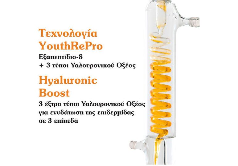 - YouthRePro TECHNOLOGY - Σύμπλεγμα ενεργοποίησης νεότητας με 3 τύπους Υαλουρονικού Οξέος και Εξαπεπτίδιο-8 για λείανση ρυτίδων, ελαστικότητα και σφριγηλό δέρμα.
