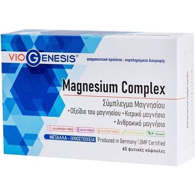 Το Viogenesis Magnesium Complex αποτελείται απο τρία είδη μαγνησίου (κιτρικό μαγνήσιο, ανθρακικό μαγνήσιο και οξείδιο του μαγνησίου) σε μία κάψουλα, για την πλήρη κάλυψη των αναγκών του οργανισμού.