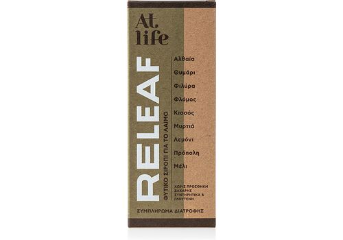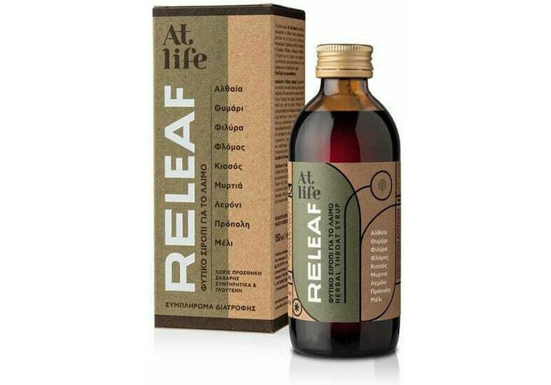 Το At Life Releaf Φυτικό Σιρόπι για τον Πονόλαιμο & τον Ξηρό Βήχα συνδυάζει εκχυλίσματα και αιθέρια έλαια από ευεργετικά βότανα μαζί με αποκερωμένη πρόπολη τιτλοδοτημένη 3% σε πολυφαινόλες και μέλι.