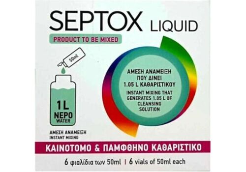 - Το Septox Liquid Instant Mixing Cleansing Solution είναι μια καινοτόμα και προσιτή λύση καθαρισμού και φροντίδας του δέρματος. Η μοναδική του σύνθεση προσφέρει εντατικό καθαρισμό, υγιεινή προστασία και βοηθά στη διατήρηση ενός καθαρού και φυσιολογικού δέρματος. Είναι κατάλληλο για όλους τους τύπους δέρματος και διατίθεται σε φιαλίδια 50ml, τα οποία αναμειγνύονται εύκολα με ένα λίτρο νερού.