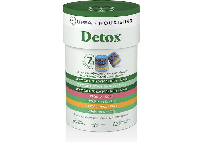 Τα Upsa Nourished Detox Gummies με γαϊδουράγκαθο, ψευδάργυρο, Citrus Sinensis, χρώμιο και βιταμίνες, συμβάλλουν στην αποτοξίνωση και στον φυσιολογικό μεταβολισμό των υδατανθράκων.