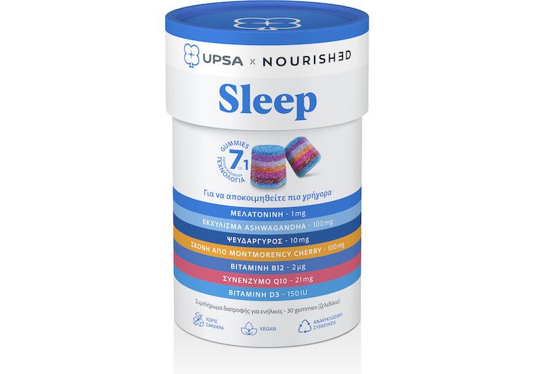 Το Upsa Nourished Sleep Gummies βοηθάει στον ύπνο. Περιέχει μελατονίνη και ασβαγκάντα, συνδυαστικά με άλλα πολύτιμα συστατικά.