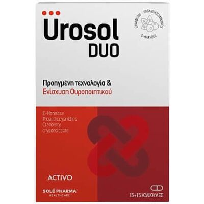 Το Urosol Duo είναι συμπλήρωμα διατροφής για λοιμώξεις του ουροποητικού συστήματος το οποίο περιέχει συνδυασμό D-Mannose, υψηλής συγκέντρωσης εκχύλισμα cranberry (Vaccinium macrocarpon) και συμπύκνωμα άγριου cranberry (Vaccinium oxycoccus) που παράγονται με προηγμένη τεχνολογία κρυοξήρανσης για τη διατήρηση όλων των συστατικών, ενισχύοντας την δράση τους.