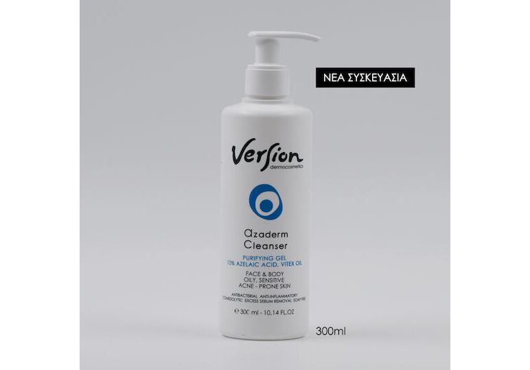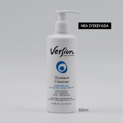 Το Version Azaderm Cleanser είναι ένα λεπτόρρευστο gel προσώπου & σώματος, ιδανικό για τον καθημερινό καθαρισμό του δέρματος με λιπαρότητα ή/και τάση ακμής.