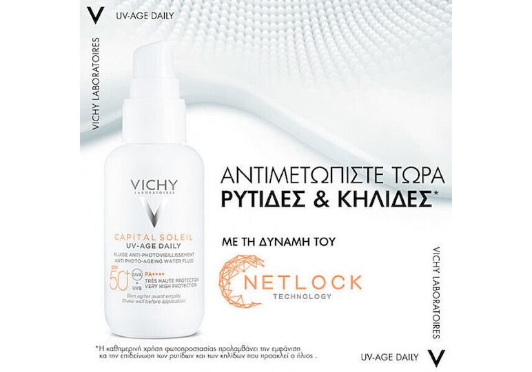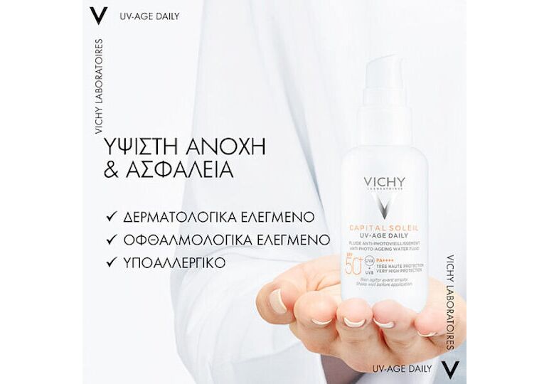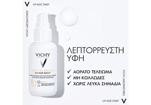 Το Vichy Capital Soleil UV-Age Daily Sunscreen SPF50+ είναι ένα εξαιρετικά λεπτόρρευστο αντηλιακό πολύ υψηλής προστασίας, με δράση κατά της φωτογήρανσης και των κηλίδων.
