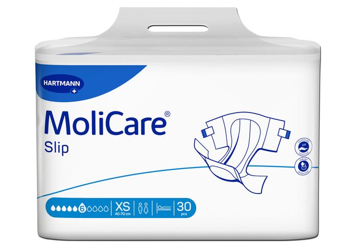 Οι MoliCare® Slip 6 σταγόνων είναι μιας χρήσης πάνες ενηλίκων που μπορούν να φορεθούν αντί για κανονικό εσώρουχο. Τέσσερις επανακλειόμενες ταινίες (δύο ταινίες στα μεγέθη XS και S) εξασφαλίζουν ασφαλή και ρυθμιζόμενη εφαρμογή, ακόμη και για μικρούς σωματότυπους.