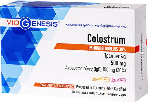Συμπλήρωμα διατροφής με πρωτόγαλα σε κάψουλες. Περιέχει ανοσοσφαιρίνες και τελομεράση. Το VioGenesis Colostrum περιέχει λυοφιλιωμένη σκόνη άπαχου γάλακτος από αγελαδινό πρωτόγαλα πρώτου και δεύτερου αρμέγματος. Παρέχει ανοσοσφαιρίνες (IgG) 150 mg (30%).